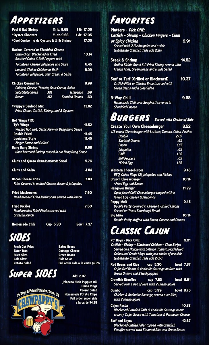 Crawpappy's Bar and Grill in Tulsa, Oklahoma, stands out as a lively local spot where flavorful Southern-inspired dishes meet a welcoming atmosphere. Nestled at 3344 E 51st St, this bar and grill offers a broad menu filled with fresh seafood delights, from crispy oysters to beloved crawfish po’boys, all crafted to highlight bold, comforting flavors. Their wings have earned a reputation as the best in Tulsa, sparking repeat visits from fans who crave that perfect balance of spice and crispness.